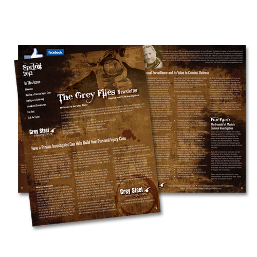 Client requested a grunge looking style newsletter for Grey Steel Investigations that could also be used as a self mailer. 11 x 17 folded in fours.Continue Reading